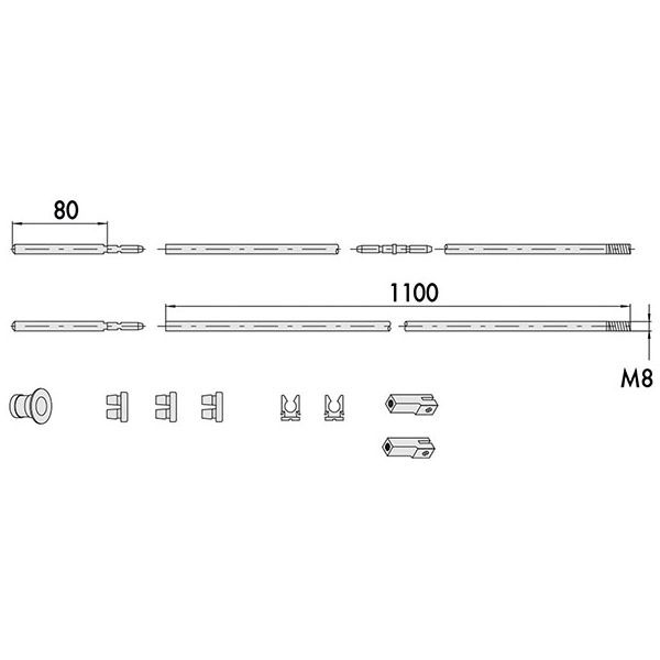 Serie completa aste serratura infilare triplice Composizione: 1 coppia aste diritte, 2 puntali monoblocco, 1 bocchetta pavimento, 1 spinotto giunzione, 2 pinze guida aste, boccole antirumore, 1 coppia boccole filettate M8 Adatte per serrature CISA 16225 16227 17357 46220 46222 46225 46227 46250 46252 46260 46270 56378 57357 57365 57375