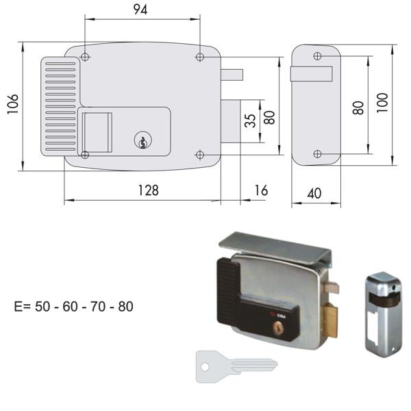 Elettroserratura V 12 porte ferro applicare Zincata – Scrocco autobloccante Tettuccio protettivo – Sottobocchetta Cilindro 02139-00-0 Misure mm 128×106 3 chiavi 01070-10-1 cod.82054