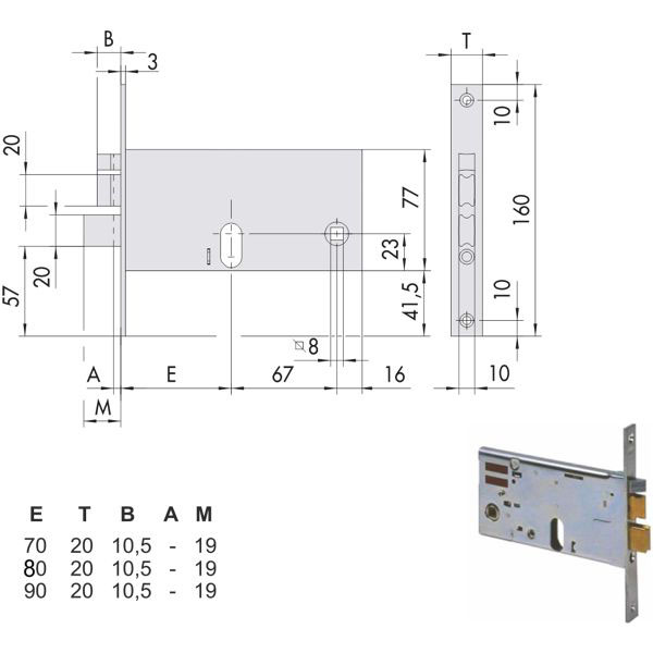 Elettroserratura V 12 porte alluminio infilare Zincata – Catenaccio 2 mandate Scrocco autobloccante Ambidestra Cilindro non incluso 2 mandate Scatola 77 – Frontale 20×160