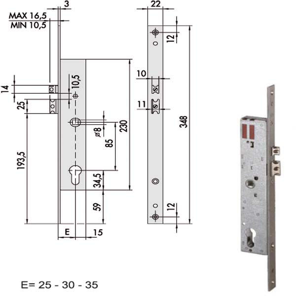 Elettroserratura V 12 porte alluminio infilare Zincata – Scrocco autobloccante regolabile da 10,5 a16,5 mm Ambidestra Cilindro non incluso Scatola 230 – Frontale inox 22×348