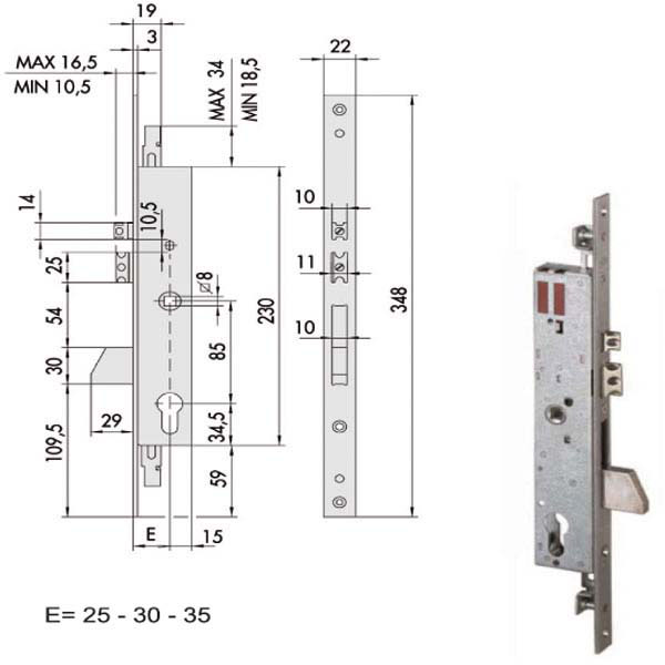 Elettroserratura V 12 porte all.infilare tripliceZincata – Catenaccio e scrocco autobloccante regolabile da 10,5 a 16,5 mm Ambidestra Cilindro non incluso Scatola 230 – Frontale inox 22×348