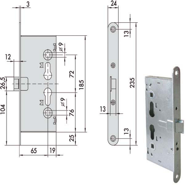 Elettroserratura V12 porte tagliafuoco infilare Zincata – Scrocco Q9 Scatola mm 84×185 Frontale mm 24×235 – Entrata mm 65 Cilindro non incluso Abbinabile maniglioni antipanico Cisa 59600/59711 Adattaper porte antipanico a tirare