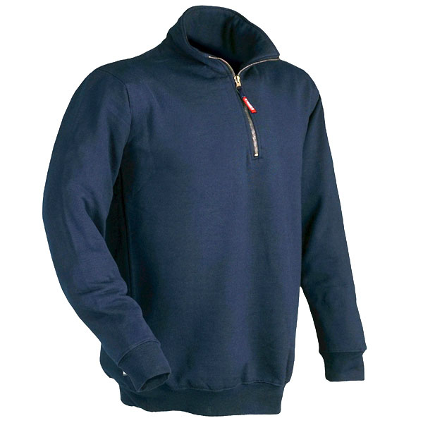 Cotone 65% poliestere 35% peso g/mq 280 Tessuto stabilizzato antirestringimento Chiusura zip corta Polsi e fascia girovita maglia elastica Colore blu