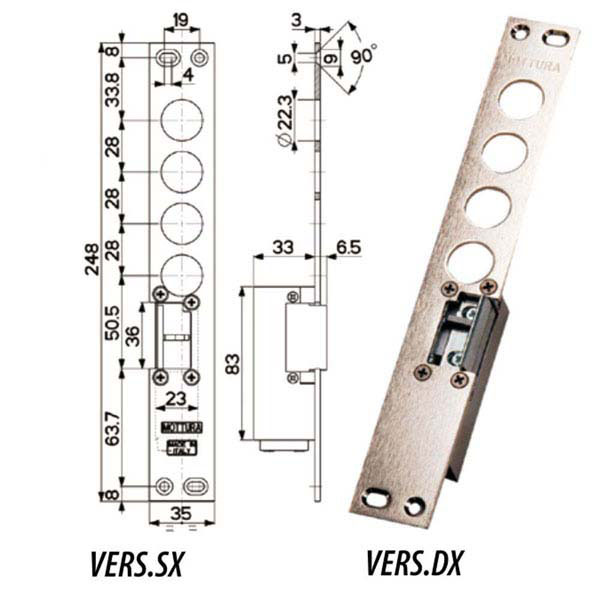 Acciaio finitura nichelata infilare Piastra diritta apertura destra/sinistra 4 fori catenacci Dimensioni mm 35×248 interasse 28 Fermo a giorno – Antiripetitore Adatto serrature Mottura serie 52 84 85