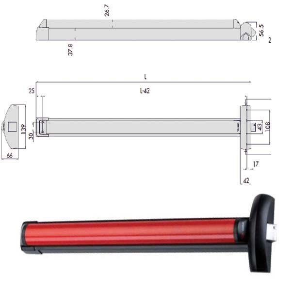 Maniglione uscite d’emergenza Carter alluminio verniciato nero Barra alluminio verniciato rosso Scrocco autobloccante – Chiusura laterale Accorciabile fino a mm 300 Mano ambidestra – Lunghezza mm 840/1200