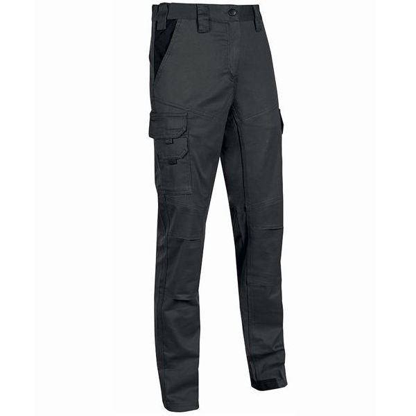 Cotone 98% Spandex 2% g/mq 245 2 tasche anteriori + 1 posteriore 2 tasche laterali portautensili + 1 portametro Elastico in vita con regolazione a scomparsa Triple cuciture – Chiusure lampo YKK Colore nero Vestibilita’ slim fit