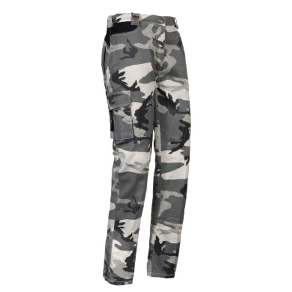 Cotone 100% g/mq 220 colore grigio mimetico Interno flanella cotone g/mq 155 2 tasche laterali + 2 tasche posteriori + tascone laterale cargo + portametro Elastico in vita + passanti – Chiusura zip