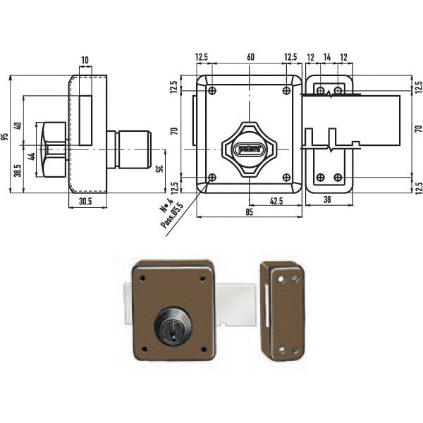 Ferroglietto verniciato marrone – Applicare legnoCatenaccio 4 mandate chiave interna Scatola mm 85×95 – Entrata mm 42,5 – Corsa mm 120 Cilindro fisso a pompa mm 50 – Diametro mm 30 3 chiavi