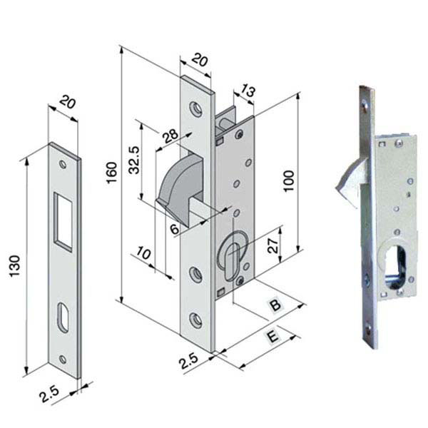 Serratura montanti alluminio infilare Acciaio nichelato – Incontro Gancio rientrante Scatola mm 43/61×100 – Frontale mm 20×160 Entrata mm 16/25 – Cilindro serie 702 non incluso