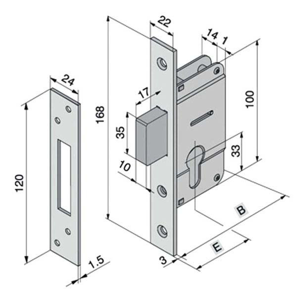 Serratura montanti alluminio infilare Acciaio nichelato – Incontro Catenaccio una mandata maggiorata mm 17 Scatola mm 72×100 – Frontale mm 22×168 Entrata mm 30 – Cilindro serie 700 non incluso