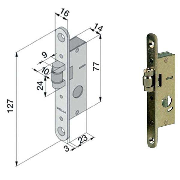 Serratura montanti alluminio infilare Acciaio nichelato – Senza incontro Rullo nylon regolabile Scatola mm 23×77 – Frontale BT mm 16×127 Entrata mm 15