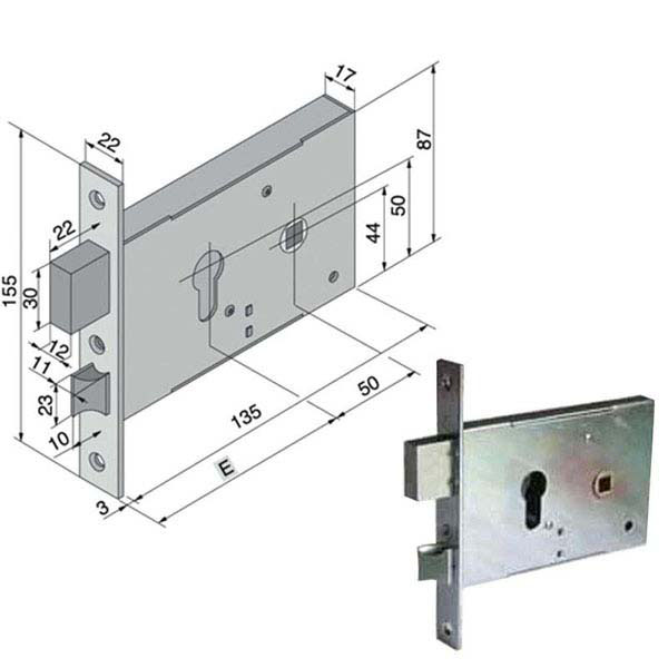 Serratura montanti alluminio infilare Acciaio zincato bianco – Catenaccio 2 mandate e scrocco reversibile – Quadro mm 8 Scatola mm 135×87 – Frontale mm 22×155 Entrata mm 50 – Cilindro serie 700 non incluso