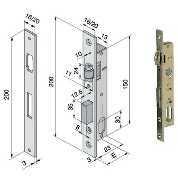Serratura montanti alluminio infilare Acciaio nichelato – Incontro Catenaccio 1 mandata e rullo regolabile Scatola mm 23×150 – Frontale mm 16/20×200 Entrata mm 15 – Cilindro serie 702 non incluso