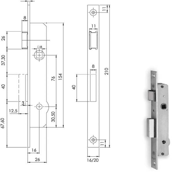 Serratura montanti alluminio da infilare Zincata – Catenaccio – Scrocco Quadro maniglia mm 8 Ambidestra Scatola 29×154 – Frontale 20×240 Chiave spillo KA inclusa