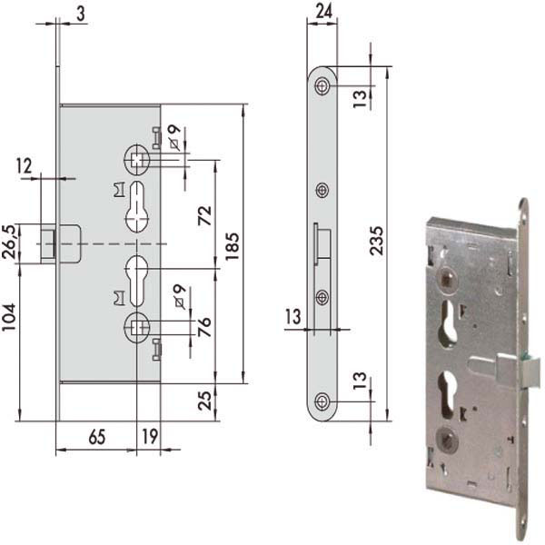 Serratura porte tagliafuoco infilare Zincata – Scrocco Q9 Scatola 84×185 Frontale mm 24×235 – Entrata mm 65 Cilindro non incluso