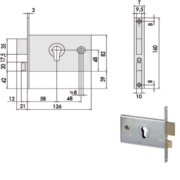Serratura fasce alluminio infilare Scrocco reversibile Catenaccio 2 mandate Zincata – Ambidestra – Entrata mm 58 Cilindro non incluso Scatola 82 – Frontale 16×160