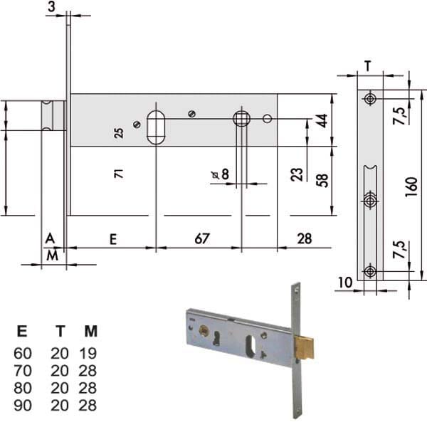 Serratura fasce alluminio infilare Scrocco catenaccio incorporato reversibile Catenaccio 1 mandata (60) 2 mandate (70/80/90) Zincata – Ambidestra Cilindro non incluso Scatola 44 – Frontale 20×160