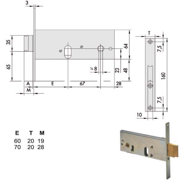 Serratura fasce alluminio infilare Scrocco catenaccio incorporato reversibile Catenaccio 1 mandata (60) 2 mandate (70) Zincata – Ambidestra Cilindro non incluso Scatola 64 – Frontale 20×160