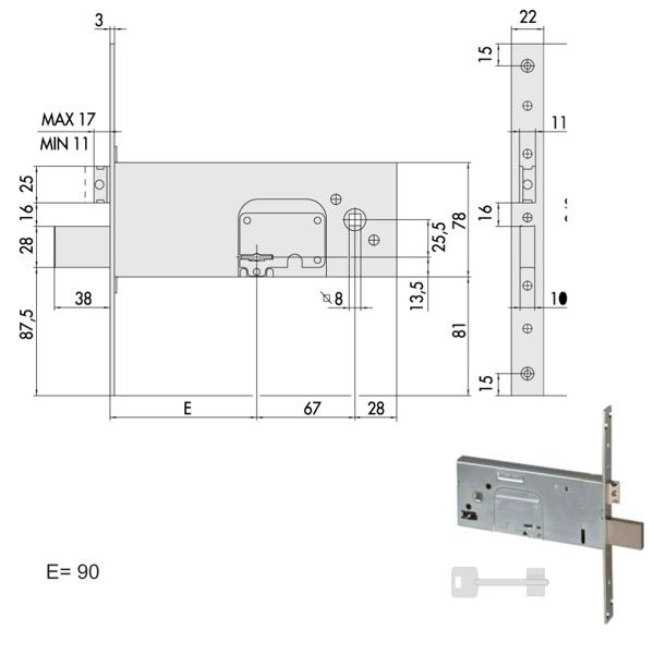 Serratura fasce alluminio infilare Zincata – Catenaccio acciaio nichelato Scrocco reversibile regolabile mm 11/17 Doppia mappa 4 mandate Ambidestra Scatola 78 – Frontale inox 22×240 3 chiavi 00100-00-1 cod.82044