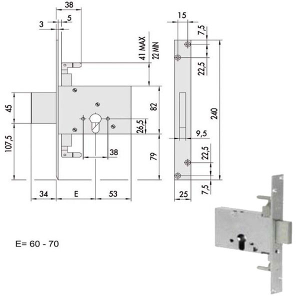 Serratura infilare ferro triplice Frontale acciaio zincato Solo catenaccio 3 mandate – Ambidestra Predisposta protettore cilindro Scatola 82 – Frontale 25×240 Cilindro non incluso