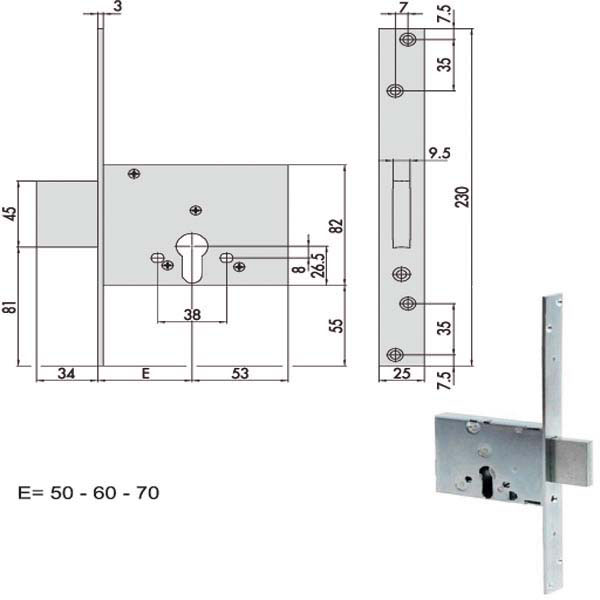 Serratura zincata infilare ferro Catenaccio acciaio zincato 3 mandate Predisposta protettore cilindro Ambidestra Cilindro non incluso Scatola 82 – Frontale 25×230