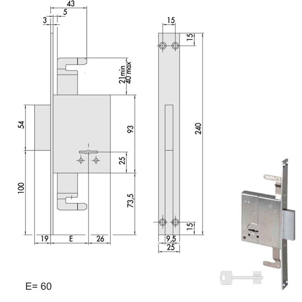 Serratura infilare ferro triplice Solo catenaccio- Ambidestra Doppia mappa 2 mandate Contropiastrainclusa Scatola 93 – Frontale 25×240 3 chiavi 00100-00-1 cod.82044