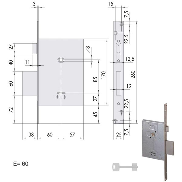 Serratura infilare ferro Catenaccio e scrocco – Ambidestra Doppia mappa 4 mandate Contropiastra inclusa Scatola 170 – Frontale 25×260 3 chiavi 00100-00-1 cod.82044