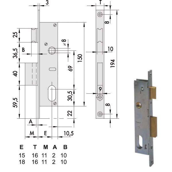 Serratura montanti alluminio infilare Zincata – Catenaccio Scrocco reversibile azionabile solo da quadro 1 mandata ambidestra Cilindro non incluso Scatola 150 – Frontale 16×194