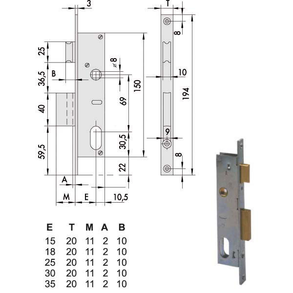 Serratura montanti alluminio infilare Zincata – Catenaccio Scrocco reversibile azionabile: E 15/18 solo da quadro E 25/30/35 sia quadro che chiave1 mandata ambidestra Cilindro non incluso Scatola150 – Frontale 20×194