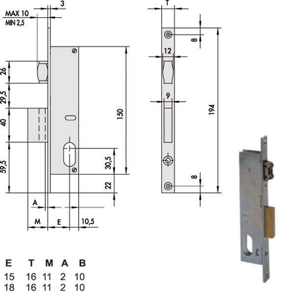 Serratura montanti alluminio infilare Zincata – Catenaccio – Rullo regolabile 2,5/16,5 1 mandata ambidestra Cilindro non incluso Scatola 150 – Frontale 16×194