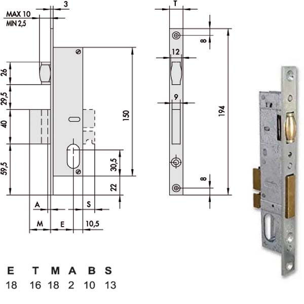 Serratura montanti alluminio infilare Zincata – Catenaccio – Rullo regolabile 2 mandate ambidestra Cilindro non incluso Scatola 150 – Frontale 16×194