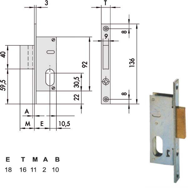 Serratura montanti alluminio infilare Zincata – Catenaccio 1 mandata ambidestra Cilindro non incluso Scatola 92 – Frontale 16×136
