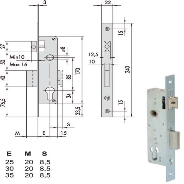 Serratura montanti alluminio infilare Frontale inox Scrocco regolabile e reversibile Catenaccio 2 mandate decentrato sporgenza mm 8,5 Ambidestra Cilindro non incluso Scatola 170 – Frontale 22×240