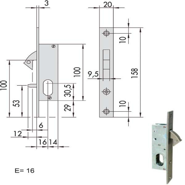Serratura montanti alluminio infilare Zincata – Gancio a mandata acciaio nichelato Contropiastra piana acciaio zincato Ambidestra Cilindro non incluso Scatola 100 – Frontale 20×158