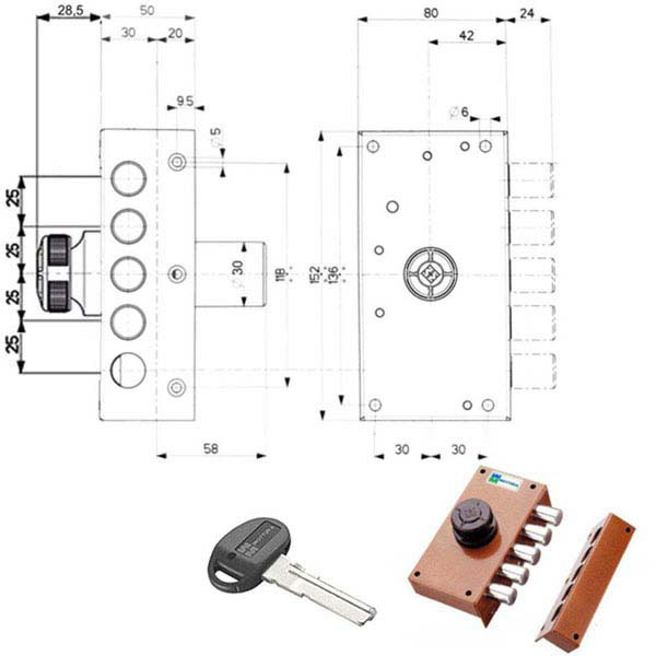 Serratura pompa applicare legno Chiusura laterale- Pomolo interno Catenacci laterali 5 pistoni Misura scatola mm 80x152x30 – Entrata mm 42 Diametro cilindro mm 30 lunghezza mm 50 3 chiavi C10 cod.84292