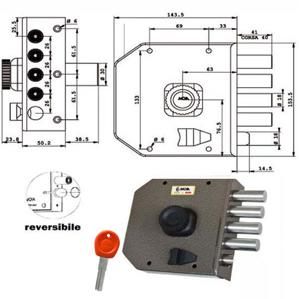 Serratura pompa chiave punzonata applicare legno Chiusura laterale – Pomolo interno Catenacci laterali 4 pistoni e scrocco reversibile Interasse catenacci mm 26 Scatola mm 143,5×153,5×29 – Entrata mm63 Dimensioni cilindro mm 30×59 5 chiavi punzonate + 2 chiavi cantiere + chiave ONE/off x disattivare chiave cantiere Chiave duplicabile con art.83687