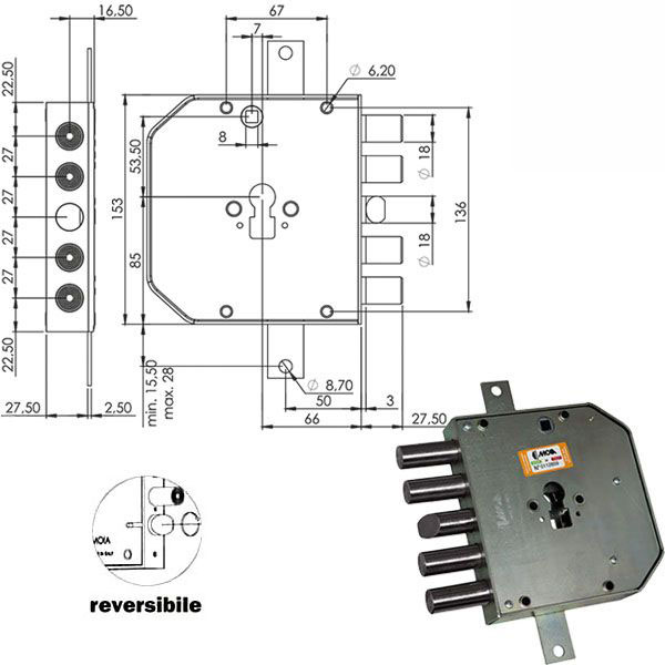 Serratura cilindro europeo a planare triplice Trappola anti effrazione – Fori protettore mm 38 Catenacci laterali 4 pistoni Scrocco centrale reversibile Interasse catenacci mm 27 – Sporgenza mm 33 Scatola mm 143x153x32 – Entrata mm 63 Cilindro non incluso