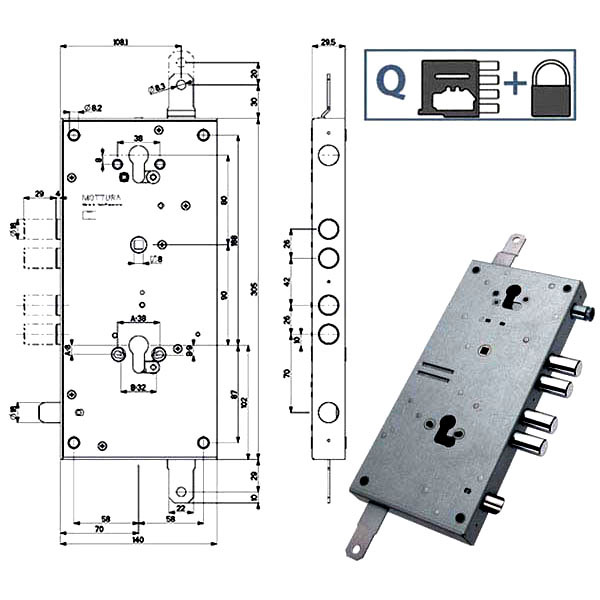 Serratura cilindro europeo a planare triplice Fori protettore mm 38 Movimento ad ingranaggi Catenacci laterali 5 pistoni e scrocco reversibile Interasse catenacci mm 26 Scatola mm 305x140x30 – Entrata mm 70 Cilindri non inclusi