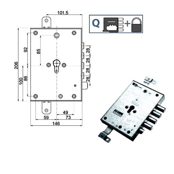 Serratura cilindro europeo a planare triplice Fori protettore mm 38 Movimento ad ingranaggi Sbalzi aste mm 24 Catenacci laterali 4 pistoni e scrocco Interasse catenacci mm 28 Scatola mm 146x206x30 – Entrata mm 73 Cilindro non incluso