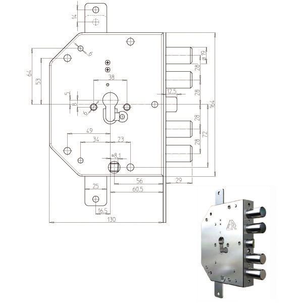 Serratura cilindro europeo a planare triplice Movimento ad ingranaggi Trappola anti effrazione – Fori protettore mm 38 Catenacci laterali 2 mandate 4pistoni e scrocco Interasse catenacci mm 28 Scrocco azionato da maniglia quadro mm 8 e chiave Scatola mm 130x164x29,5 – Entrata mm 60,5 Cilindro nonincluso