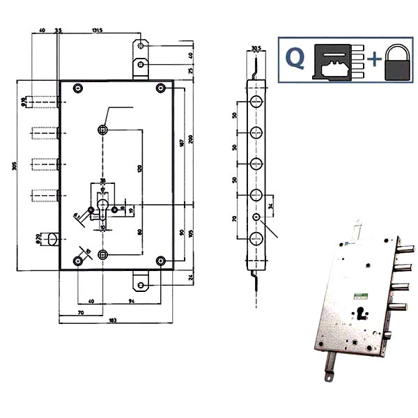Serratura cilindro europeo a planare triplice Fori protettore mm 38 Chiusura frizionata tramite pomolo Catenacci laterali 4 pistoni e scrocco Scatolamm 185x305x32 – Entrata mm 70 Cilindro non incluso Modello SERRABLINDA