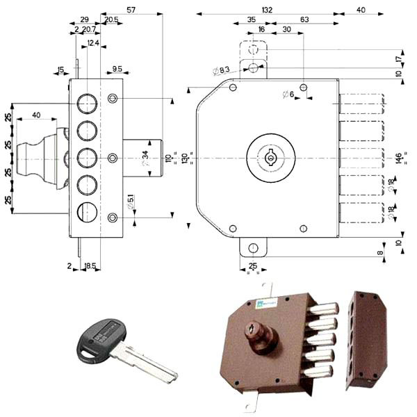 Serratura pompa applicare legno triplice Doppia pompa esterna/interna Catenacci laterali 5 pistoni Misura scatola mm 132x146x30 – Entrata mm 63 Diametro cilindro mm 34 lunghezza mm 50 Aste non incluse 3 chiavi C10 cod.84292