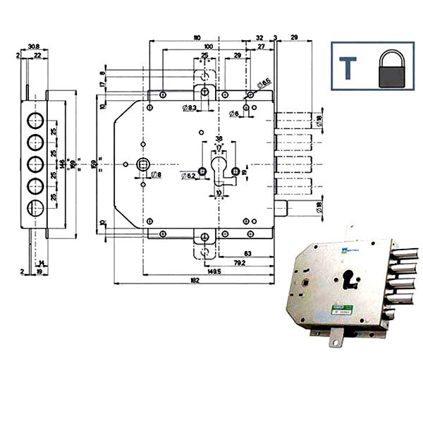 Serratura cilindro europeo a planare triplice Fori protettore mm 38 Catenacci laterali 4 pistoni e scrocco Scatola mm 182x159x35 – Entrata mm 63 Cilindro non incluso