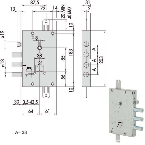 Serratura doppia mappa a planare Catenacci laterali 3 pistoni e scrocco reversibile Interasse catenacci mm 38 Sporgenza da chiusa mm 21,5 2 chiusure verticali Scatola 125×203 – Entrata mm 85,5 Adatta per porte sicurezzaALIAS