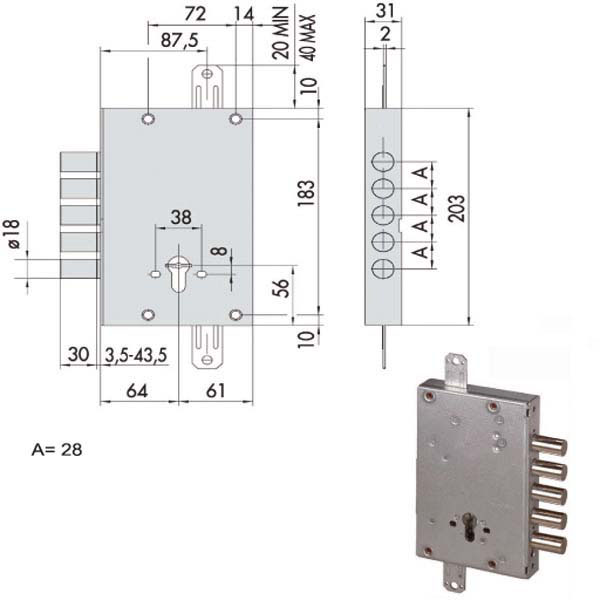 Serratura cilindro europeo a planare Catenacci laterali 5 pistoni Interasse catenacci mm 28 2 chiusure verticali Scatola 125×203 – Entrata mm 64 Cilindro non incluso