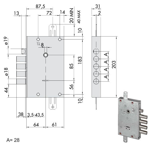 Serratura doppia mappa a planare Catenacci laterali 4 pistoni e scrocco reversibile Interasse catenacci mm 28 2 chiusure verticali Scatola 125×203 – Entrata mm 64
