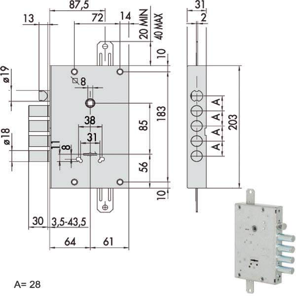 Serratura doppia mappa a planare Catenacci laterali 4 pistoni e scrocco reversibile Interasse catenacci mm 28 2 chiusure verticali Scatola125x203 – Entrata mm 64 Sistema gorges Cambio Facile